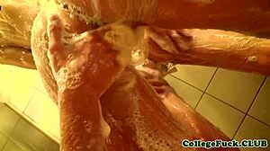 Coed dorm shower turns into close-up teen pussy rubbing tease