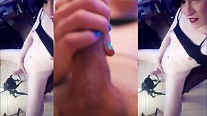 Watch this tranny femboy stroke her cock in black dress until massive cum explosion