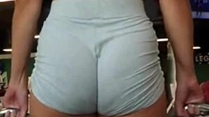 Tanned Fitness Babe Provokes With Shaved Pussy In White Shorts, No Panties, Films Big Clit Masturbation Close Up