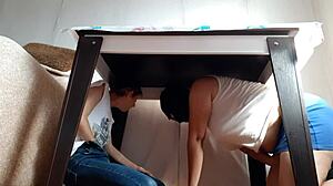 Thrilling fear grips us hiding under table masturbating from stepparents