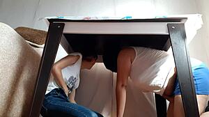 Thrilling fear grips us hiding under table masturbating from stepparents