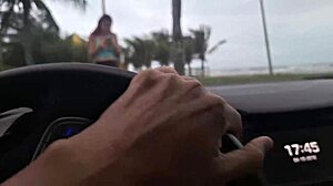 Beautiful British girl risks public car masturbation on beach sidewalk