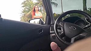 Beautiful British girl risks public car masturbation on beach sidewalk