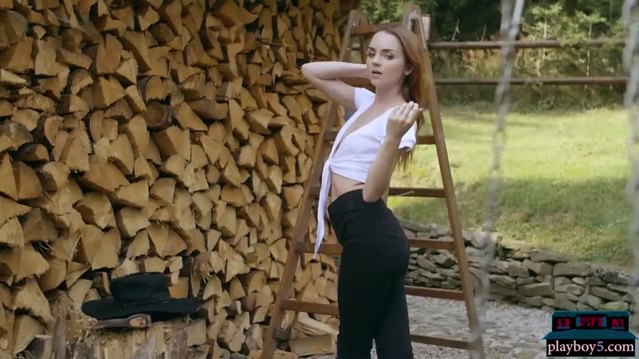 Small titted redhead Russian babe Kate Great chops wood outdoors